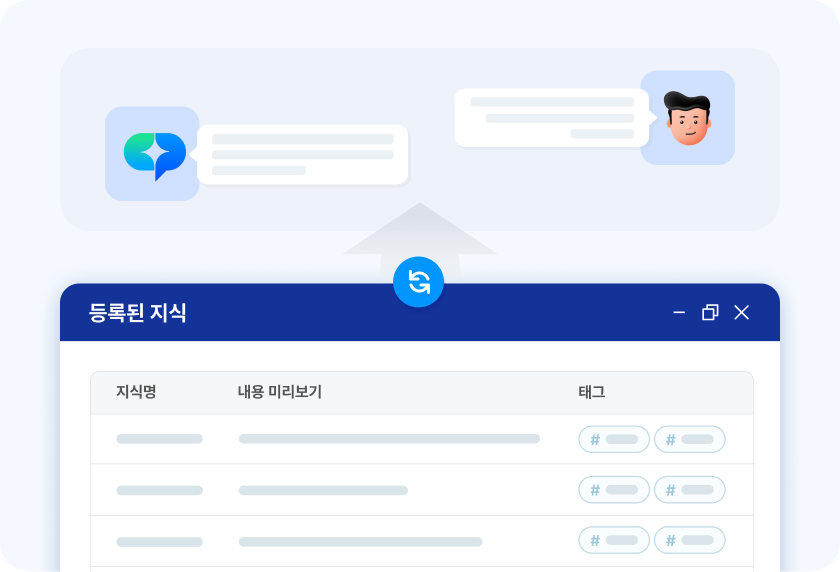고객이 업로드한 자료를 기반으로 지식베이스를 자동으로 구축하며, 비전문가도 쉽게 대화 서비스를 설정할 수 있습니다.