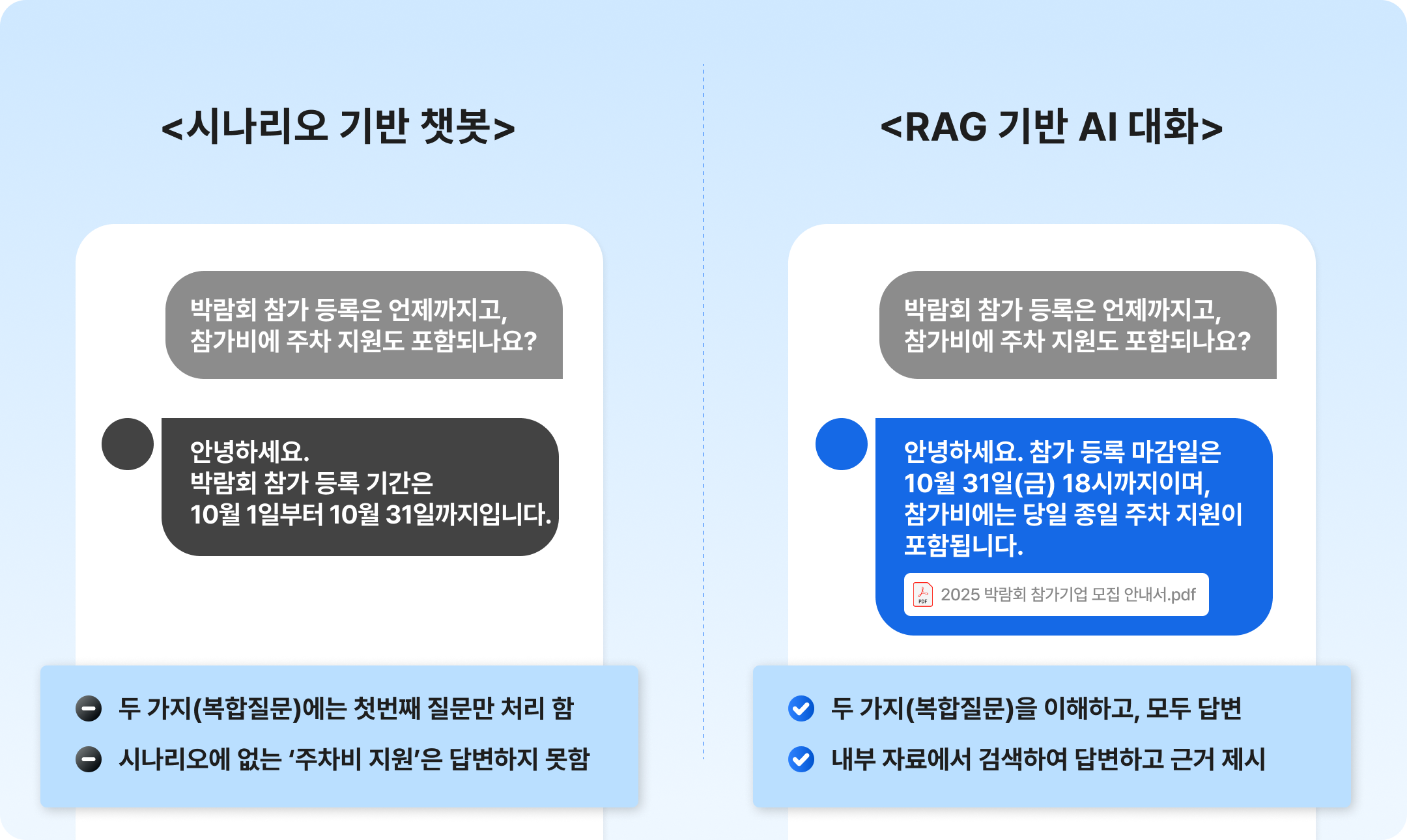 [예시 화면 1: 박람회 참가 문의 - 일반 챗봇 vs. RAG 챗봇]