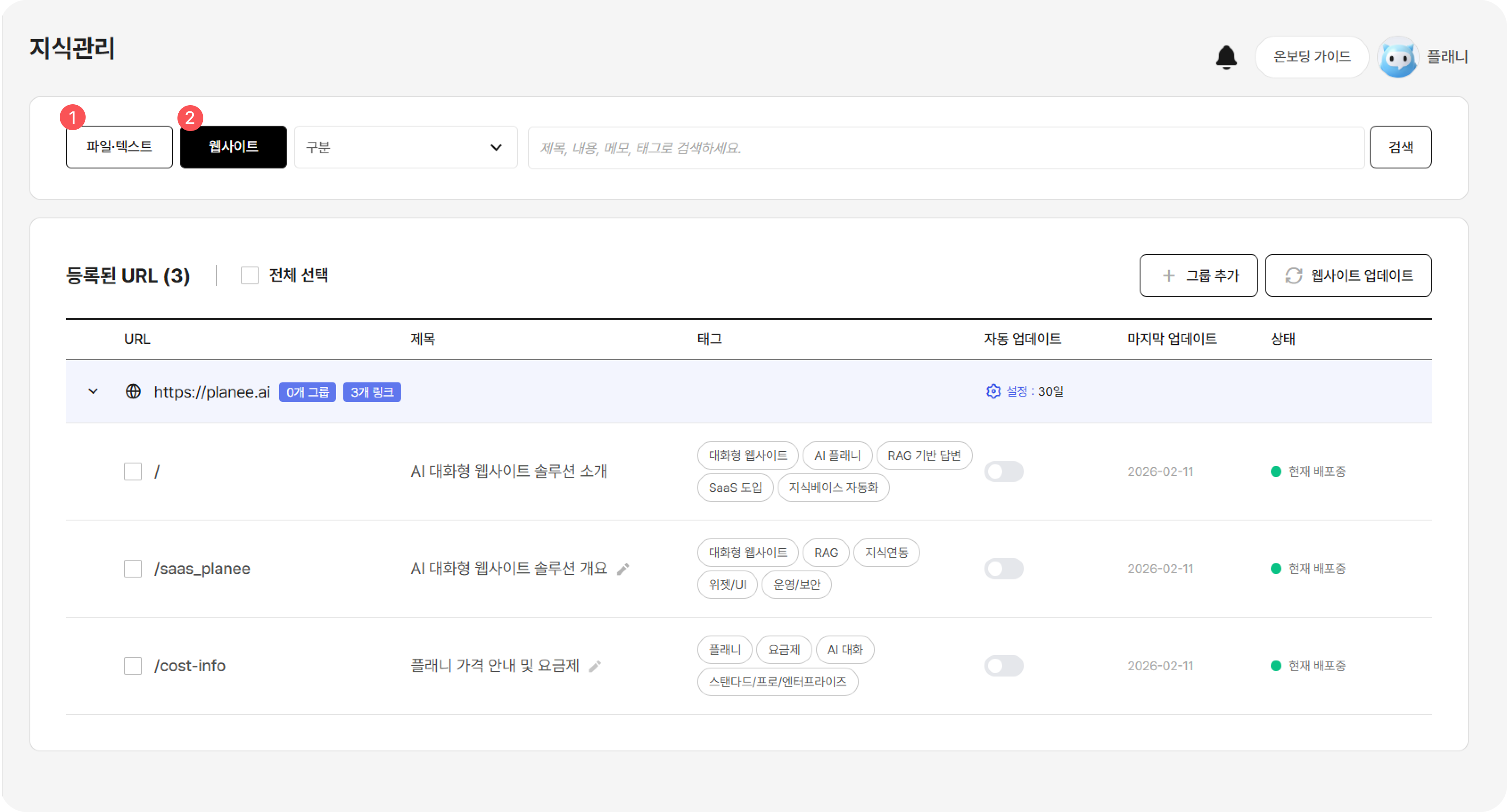 이제 별도의 문서 업로드 없이도 운영 중인 웹사이트를 그대로 AI 지식 자산으로 전환할 수 있습니다.